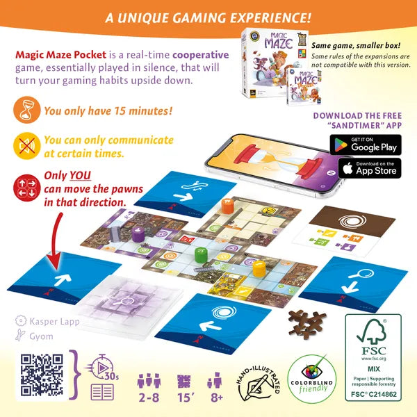 Magic Maze is a real-time, cooperative game. Each player can control any hero in order to make that hero perform a very specific action, to which the other players do not have access: Move north, explore a new area, ride an escalator… All this requires rigorous cooperation between the players in order to succeed at moving the heroes prudently. However, you are allowed to communicate only for short periods during the game; the rest of the time, you must play without giving any visual or audio cues to each other. If all of the heroes succeed in leaving the shopping mall in the limited time allotted for the game, each having stolen a very specific item, then everyone wins together.