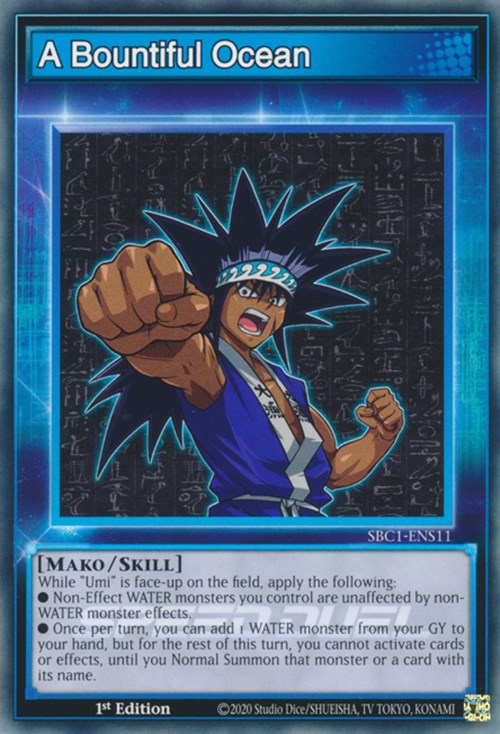 While "Umi" is face-up on the field, apply the following: • Non-Effect WATER monsters you control are unaffected by non-WATER monster effects. • Once per turn, you can add 1 WATER monster from your GY to your hand, but for the rest of this turn, you cannot activate cards or effects, until you Normal Summon that monster or a card with its name.