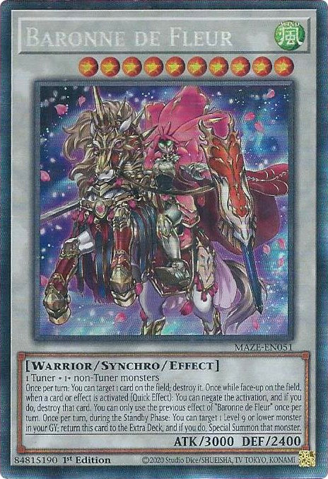 Once per turn: You can target 1 card on the field; destroy it. Once while face-up on the field, when a card or effect is activated (Quick Effect): You can negate the activation, and if you do, destroy that card. You can only use the previous effect of "Baronne de Fleur" once per turn. Once per turn, during the Standby Phase: You can target 1 Level 9 or lower monster in your GY; return this card to the Extra Deck, and if you do, Special Summon that monster.